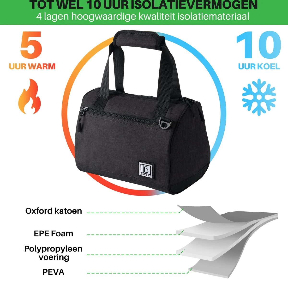 Brisby 4 Laags Geïsoleerde Koeltas – Lunchtas 10 liter – Zwart – 2 Gratis koelelementen – Koelen en warm houden