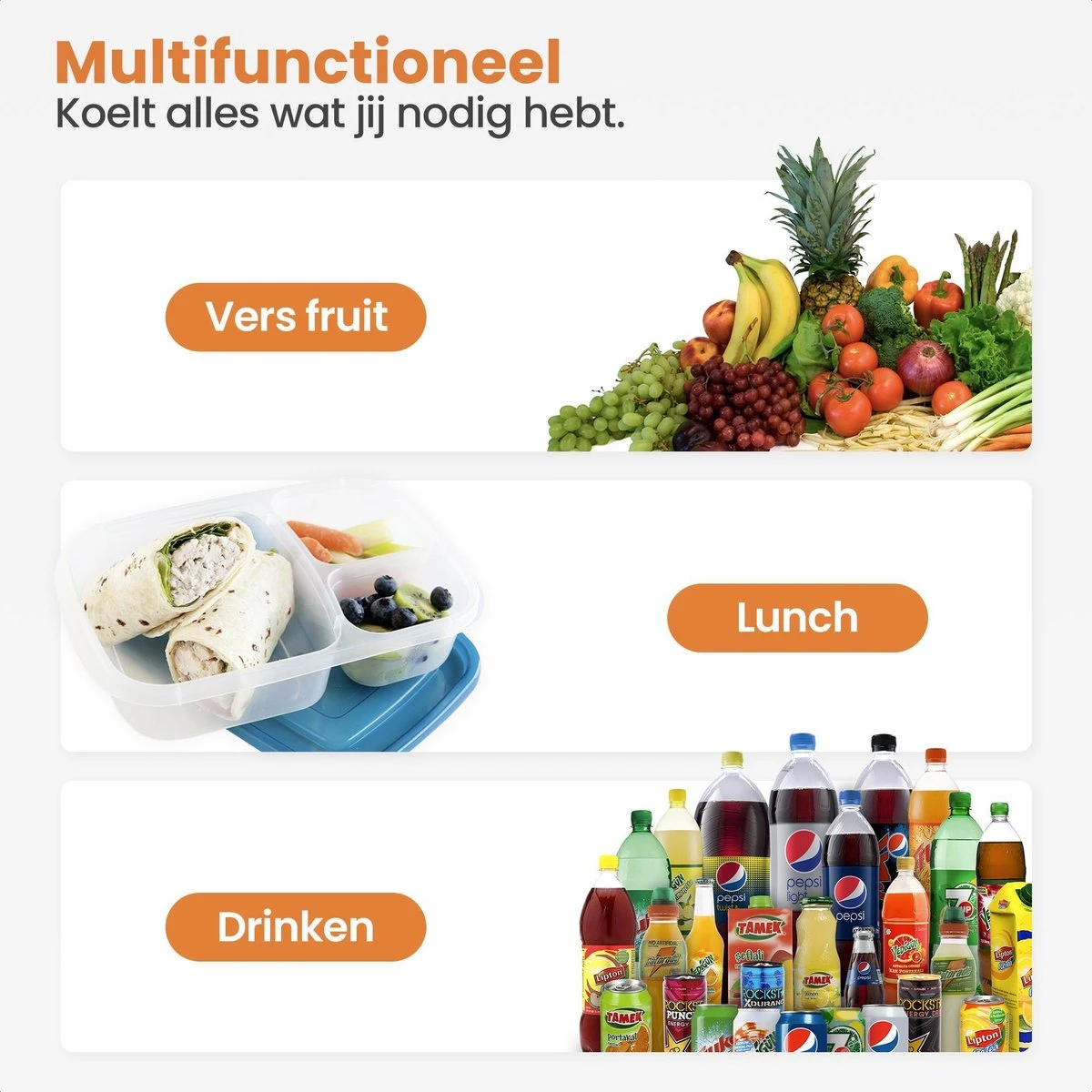 Door de handige scheiding midden in de tas kun je ook een fles en voedsel meenemen zonder dat de fles je eten platdrukt. De tas is ook de ideale grootte om mee te nemen als handbagage. Door de lange koeltijd van 6 uur kun je overal naartoe in Europa vliegen zonder dat je eten of drinken warm wordt!