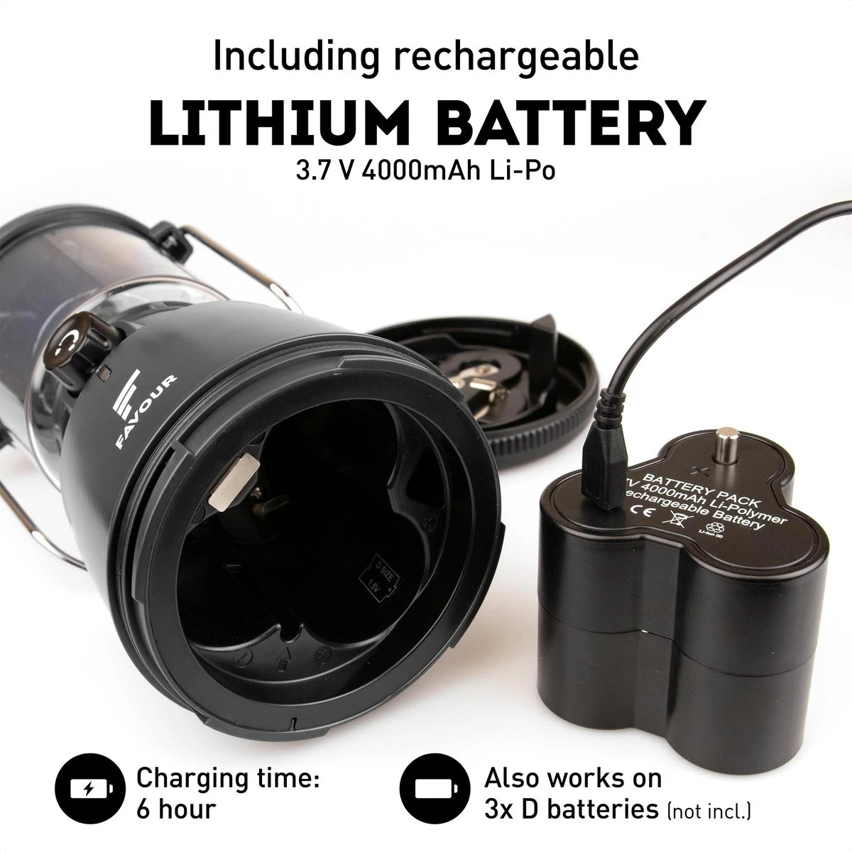 Wil je graag kampeerverlichting aan een balk of in de tent ophangen? Geen probleem, want er zijn twee ophangmogelijkheden. De campinglantaarn heeft een uitklapbare beugel en aan de onderkant van de lantaarn zit een geïntegreerde haak. Tip voor liefhebbers van direct licht: draai eenvoudigweg de lampenkap eraf. Daardoor verbeterd de lichtopbrengst waardoor de gehele tent verlicht kan worden.