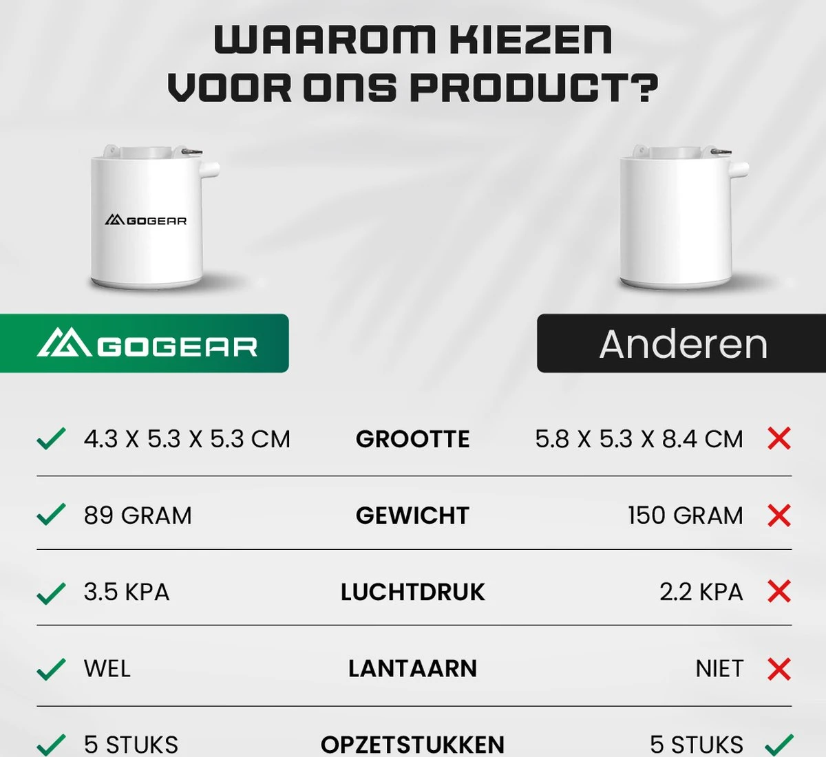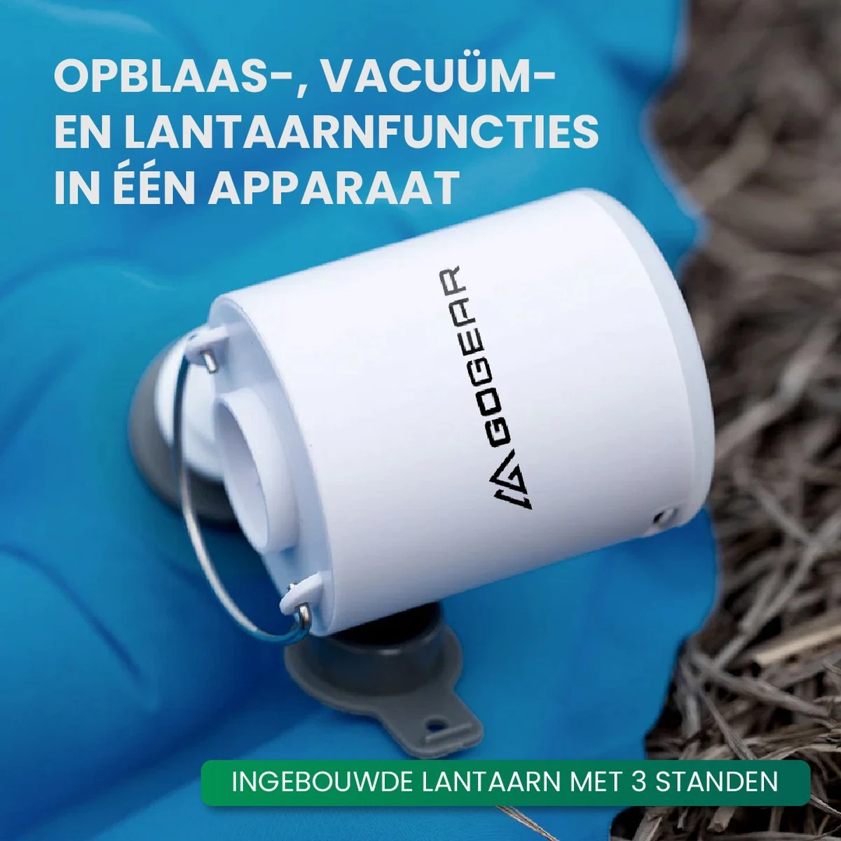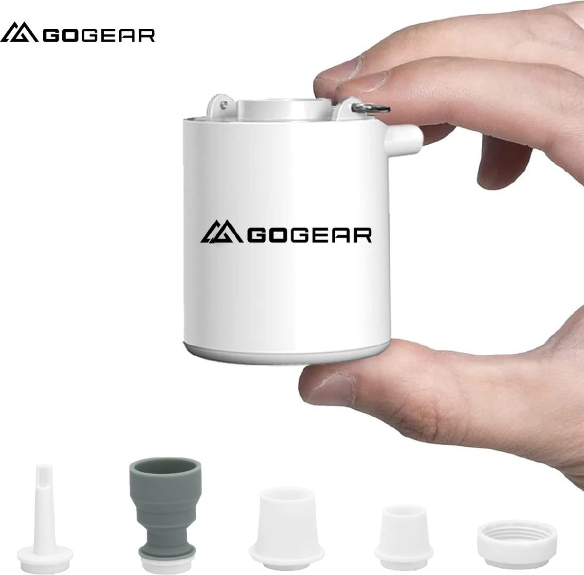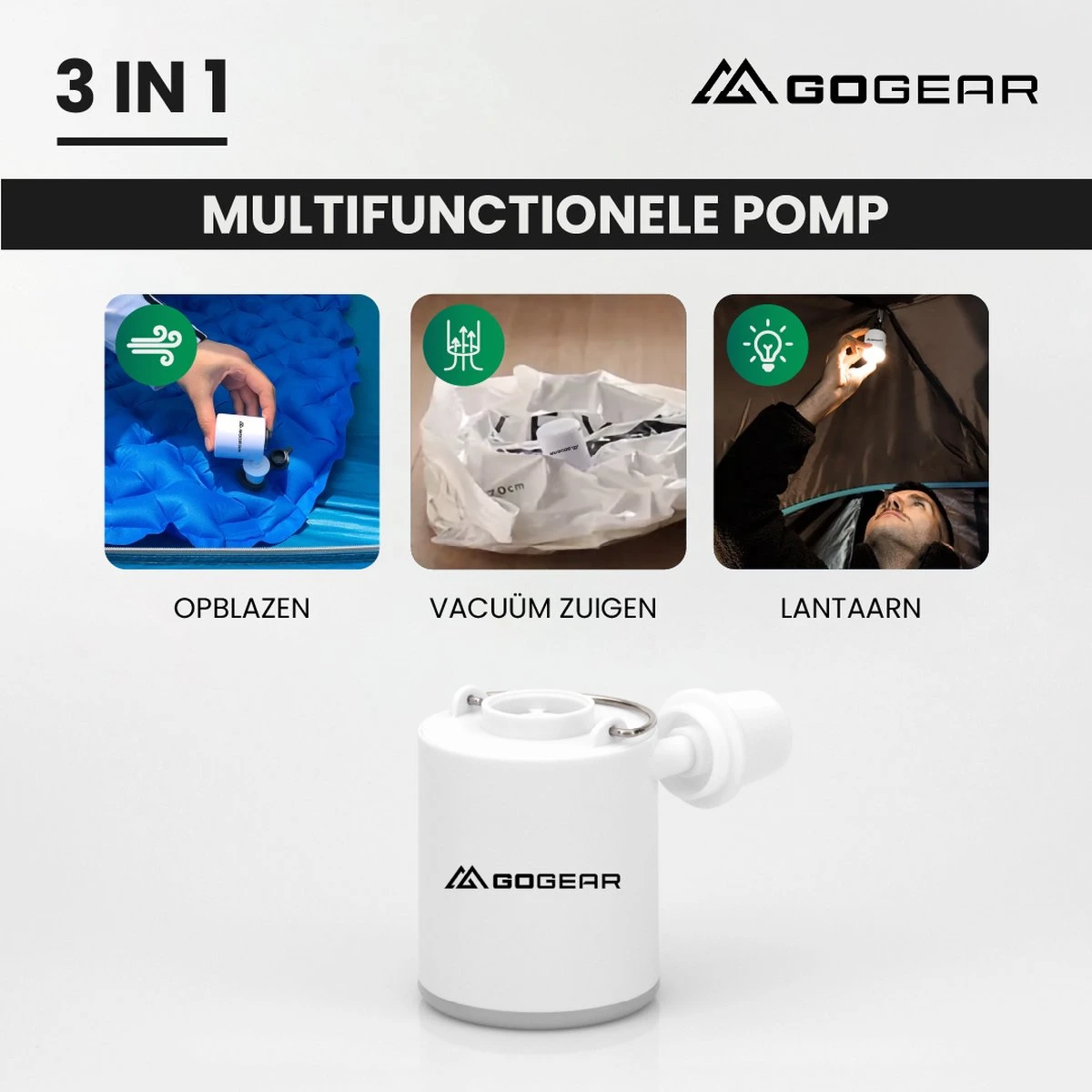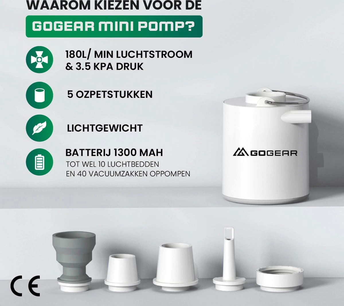 Heb je last van een zware, onhandige luchtpomp die je niet gemakkelijk kunt meenemen op reis of avontuur? Dan is de GOGEAR MINI PUMP de perfecte oplossing! Dit is s ‘werelds kleinste elektrische luchtpomp en heeft de kracht van een professionele, zware pomp, maar weegt slechts 89 gram – net zoveel als een veertje! Dit compacte en lichtgewicht pompje is ideaal voor het opblazen van je luchtbed, bootje of luchtringen, maar kan ook gebruikt worden om vacuüm te zuigen van vacuümzakken en luchtbedden leeg te laten lopen. En als dat nog niet genoeg is, kan het ook dienen als lantaarn in je tent. Ontdek hoe de GOGEAR MINI PUMP jouw problemen kan oplossen en voeg het vandaag nog toe aan je reisuitrusting!