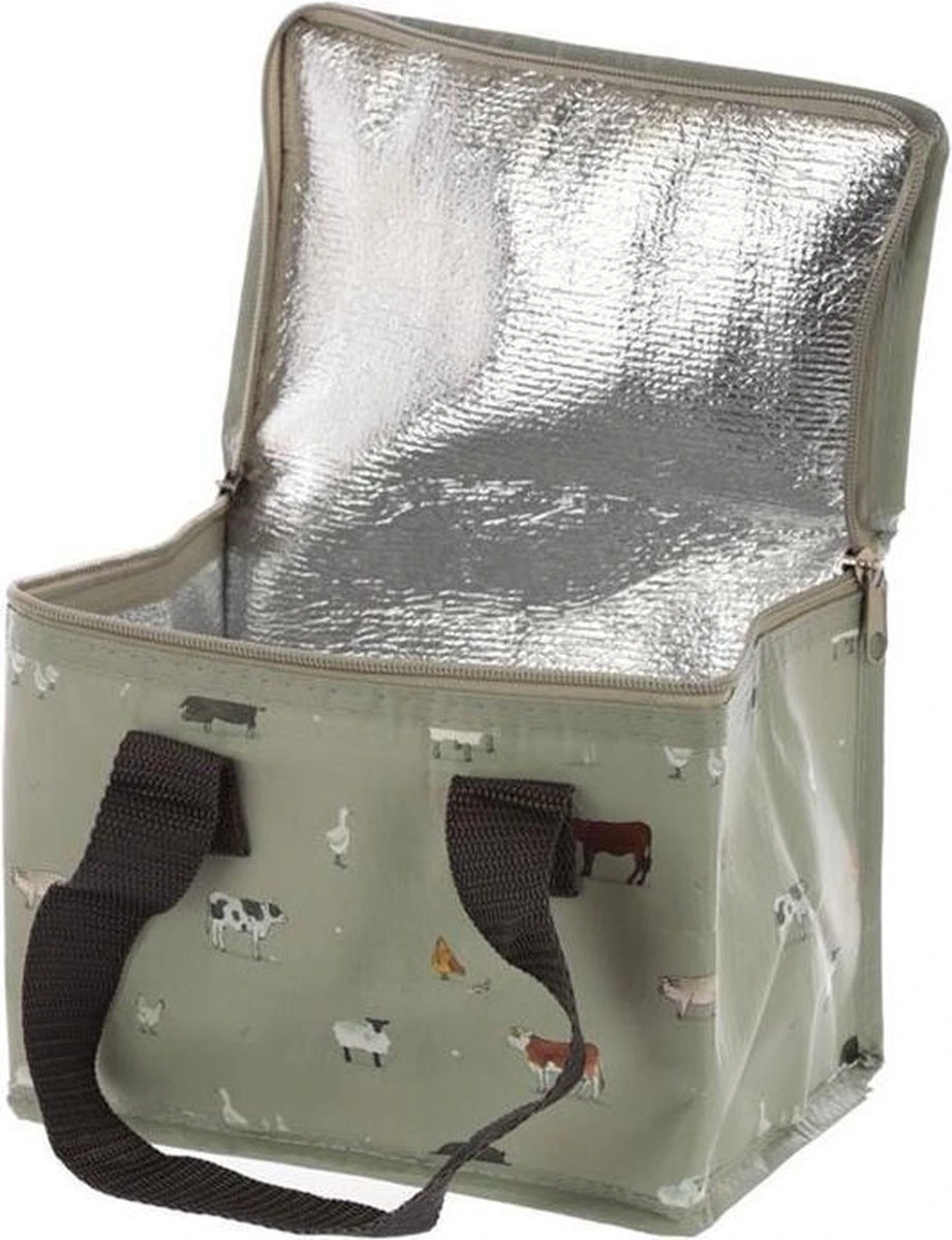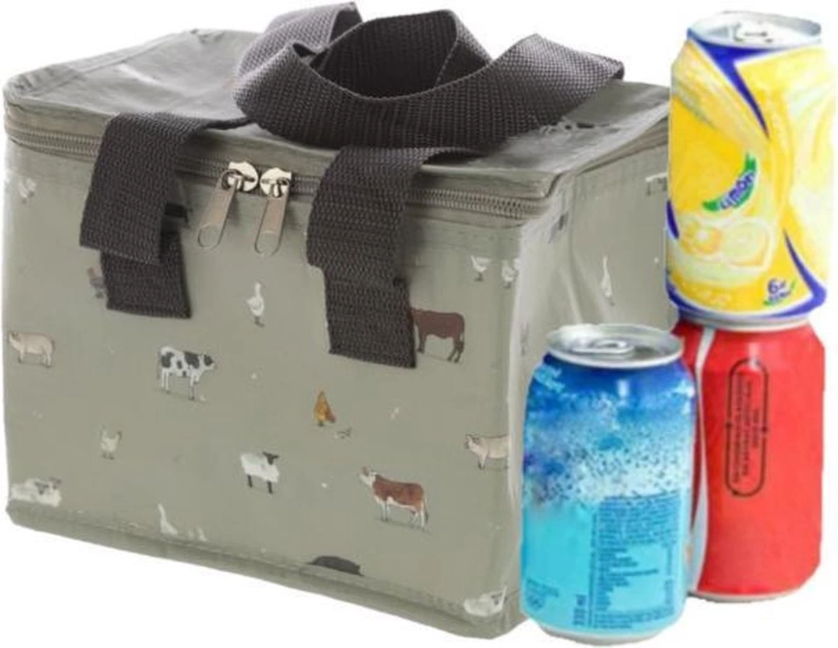 Handige grijze koeltas met boerderij dieren print om uw lunch of six-pack blikjes koel te houden. Afmetingen: 16 x 21 x 14 cm. Inhoud ca. 4,7 liter. Materiaal: polypropyleen.