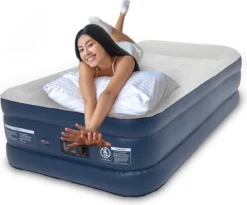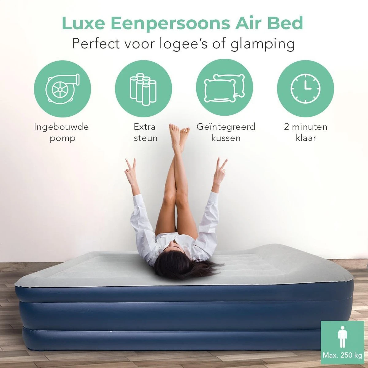 Altijd al een keer willen glampen of een logeerbed willen hebben waar je een gat in de dag op kan slapen? Het eenpersoons LifeGoods airbed heeft 21 luchtspiralen die ervoor zorgen dat je altijd comfortabel ligt. Met de ingebouwde pomp blaas je het airbed in 2 minuten op. De 8 cm dikke bovenrand is ideaal als hoofdkussen. Het bed is 191,00 x 99,00 x 46,00 cm en kan 250 kg aan. Daarbij is het airbed niet alleen zacht en waterproof, maar ook slijtvast en lekbestendig! Mocht het airbed toch lek gaan, kan hem gemakkelijk repareren met de meegeleverde reparatiekit. Stop het airbed in de draagtas, neem het mee in de kofferbak en slaap altijd met ultiem comfort!
