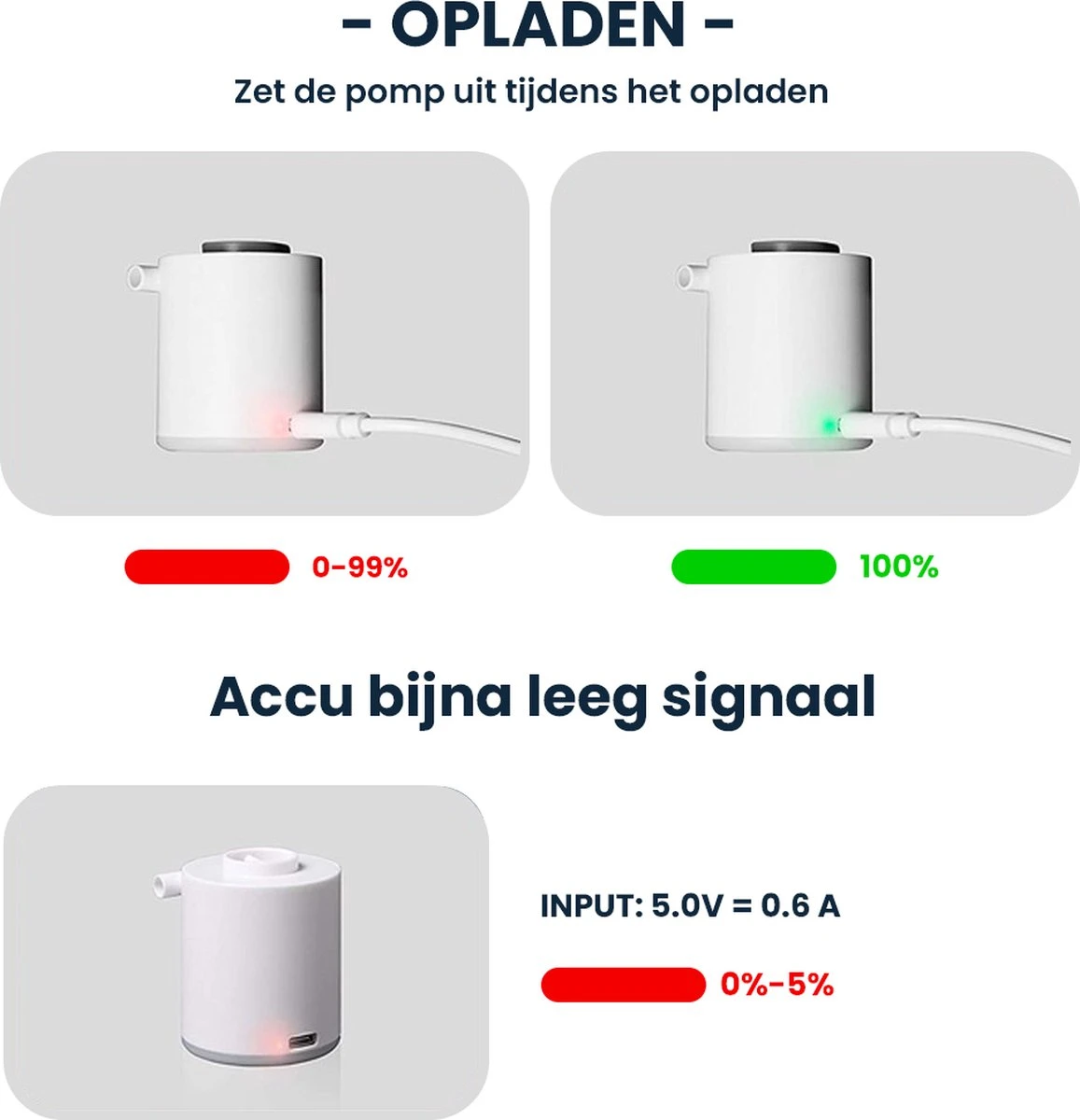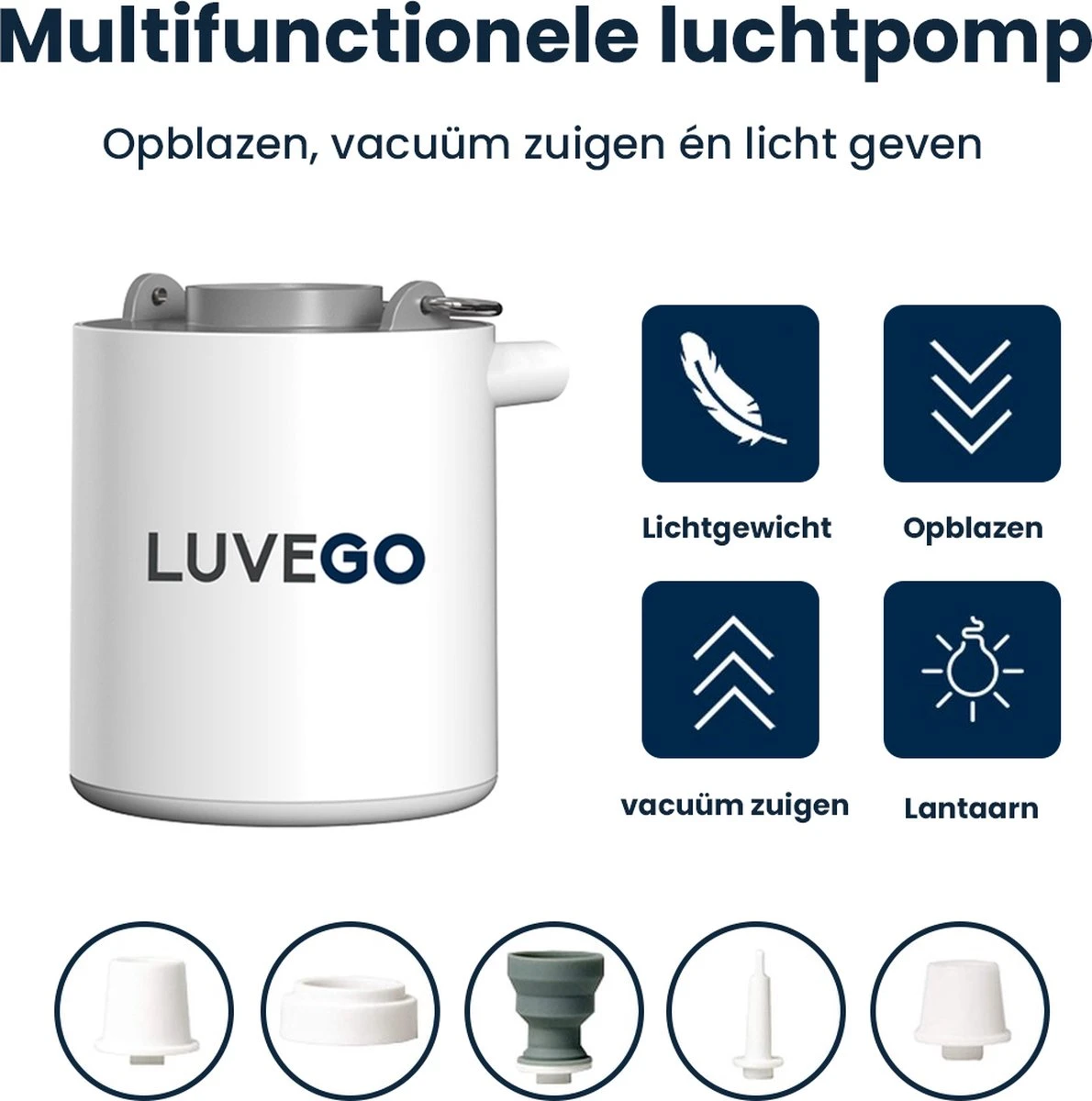 ’S werelds kleinste elektrische luchtpomp. De Luvego MINI PUMP is een pompje welke kracht heeft van een grote zware pomp maar het gewicht van een veertje (89 gram!). dit opblaaspompje is uitermate geschikt voor het opblazen van je luchtbed, bootje, luchtringen, vacuüm zuigen van vacuümzakken, luchtbed leeg laten lopen maar ook als lantaarn in je tent bijvoorbeeld!