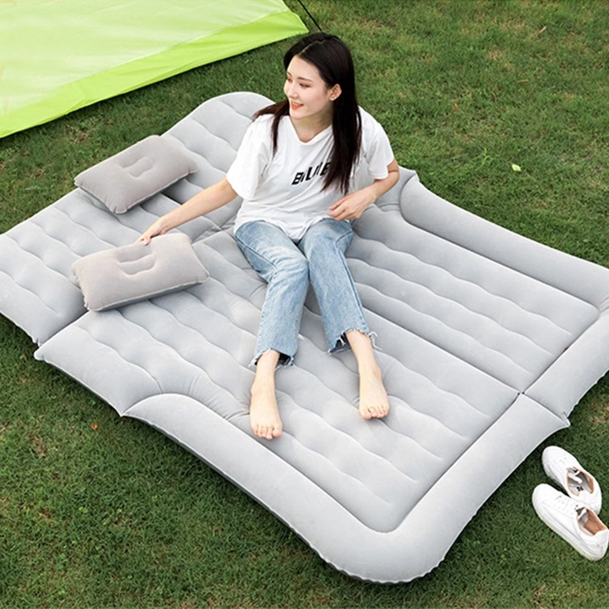 Dit luchtbed kan op verschillende manieren worden gebruikt. Het kan worden gebruikt voor twee personen als de achterbank naar beneden kan worden geduwd of wanneer u in een tent slaapt. Het luchtbed kan ook worden gebruikt voor één persoon als u op de achterbank wil liggen. Het is een erg flexibel luchtbed, want er zijn zes verschillende delen die los van elkaar kunnen worden opgepompt. U kunt het luchtbed moeiteloos oppompen met de elketriche pomp die kan worden aangesloten in elke auto. Als het luchtbed volledig is opgepompt en er net te weinig ruimte is, kan de verdikte rand aan de zijkant en het voeteneind leeg worden gelaten.