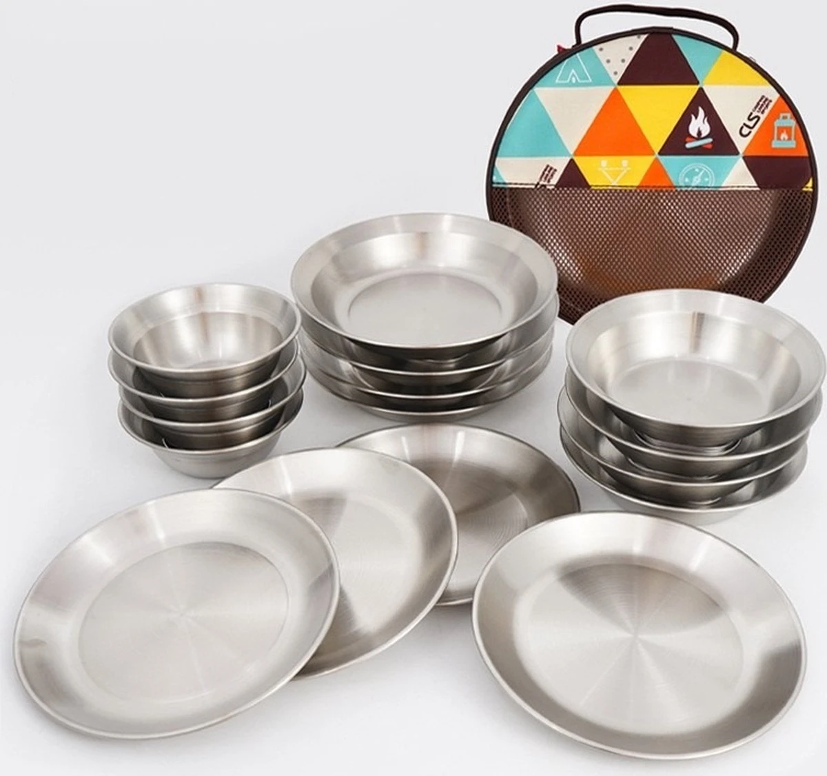 Een 16 delig RVS kampeer servies.