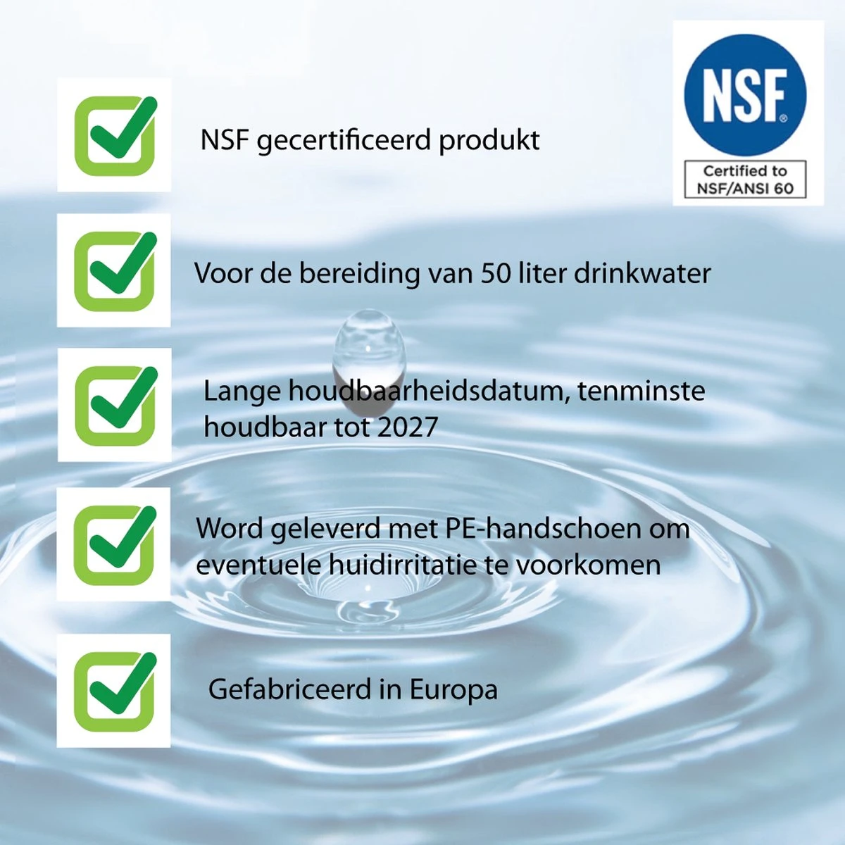 In totaal dus 50 tabletten goed voor in totaal 50 liter water.