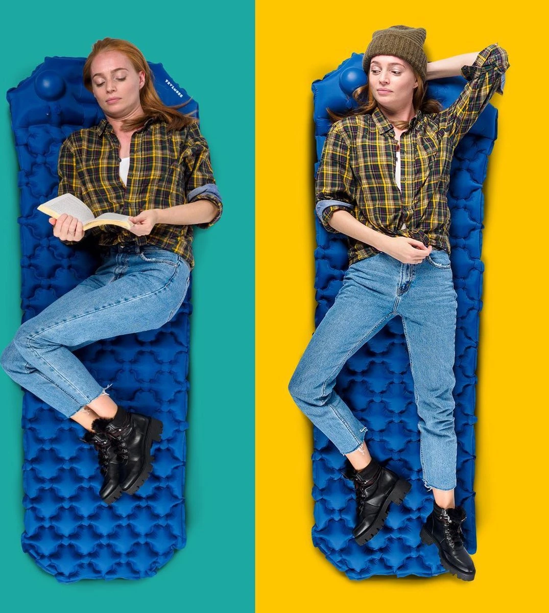 Een comfortabel en compact slaapmatje die makkelijk in je rugzak past? Blaas de TRVLMORE slaapmat in 2 minuten op met de geïntegreerde voetpomp en kruip in bed! Heerlijk comfortabel en gemaakt van zacht en stevig 40D nylon. De slaapmat is 6 cm dik en is afgewerkt met een vochtbestendige TPU coating. Het hoofdkussen heeft een ideale hoogte voor je nek. Het honingraat ontwerp houdt je lichaamswarmte goed vast. Zo kun je er de volgende dag weer helemaal tegenaan!