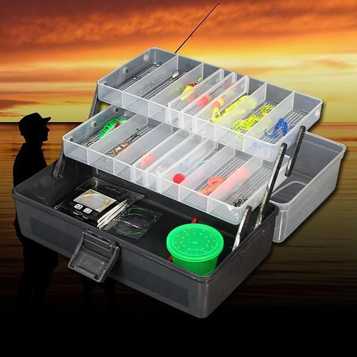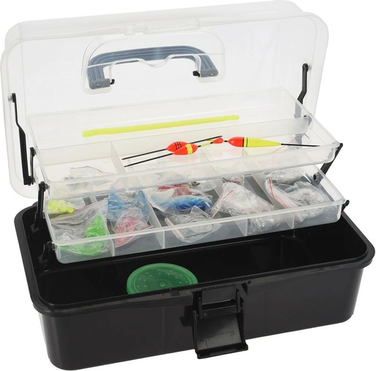 De koffer is uit te klappen zodat meerdere plateaus met vakken direct bereikbaar zijn